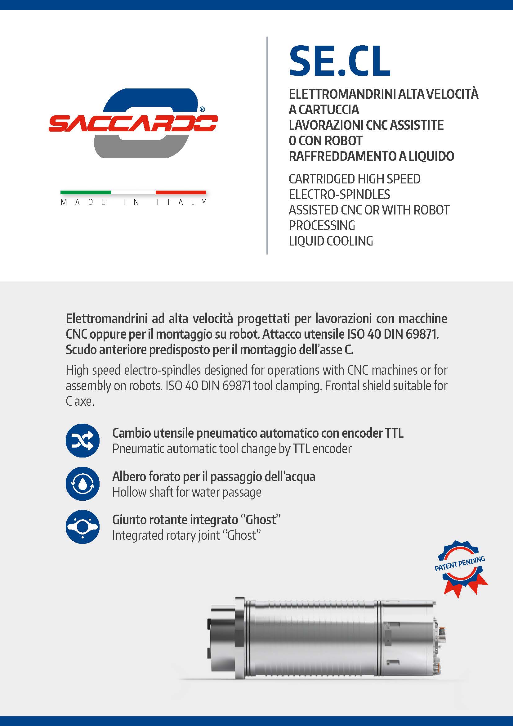 专为 CNC 机床操作或机器人组装而设计的高速电主轴。ISO 40 DIN 69871 刀具夹紧。正面盾牌适用于 C 轴。