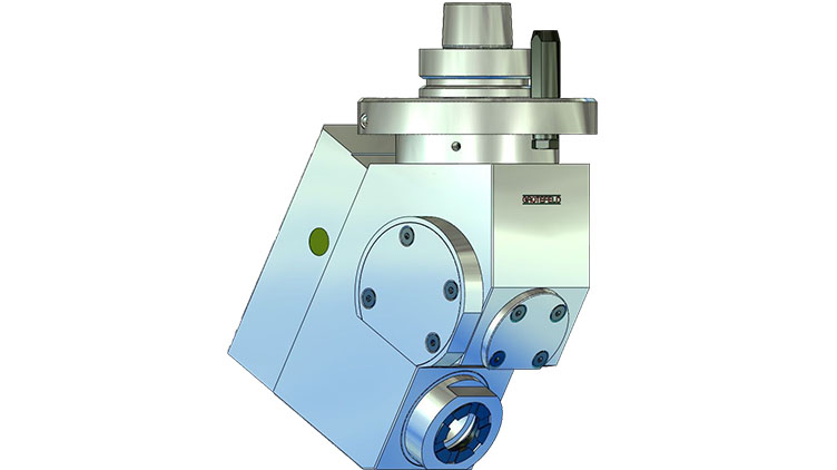 W56 角铣头配备加工主轴,可在向上 15° 至最大向下 31° 的范围内以固定角度布置。之后无法更改指定的角度。主轴的旋转方向与驱动器的旋转方向相反。驱动速度以 1:2.06 的比例传输到刀架。间歇运行时主轴最高转速可达 16,000 rpm。