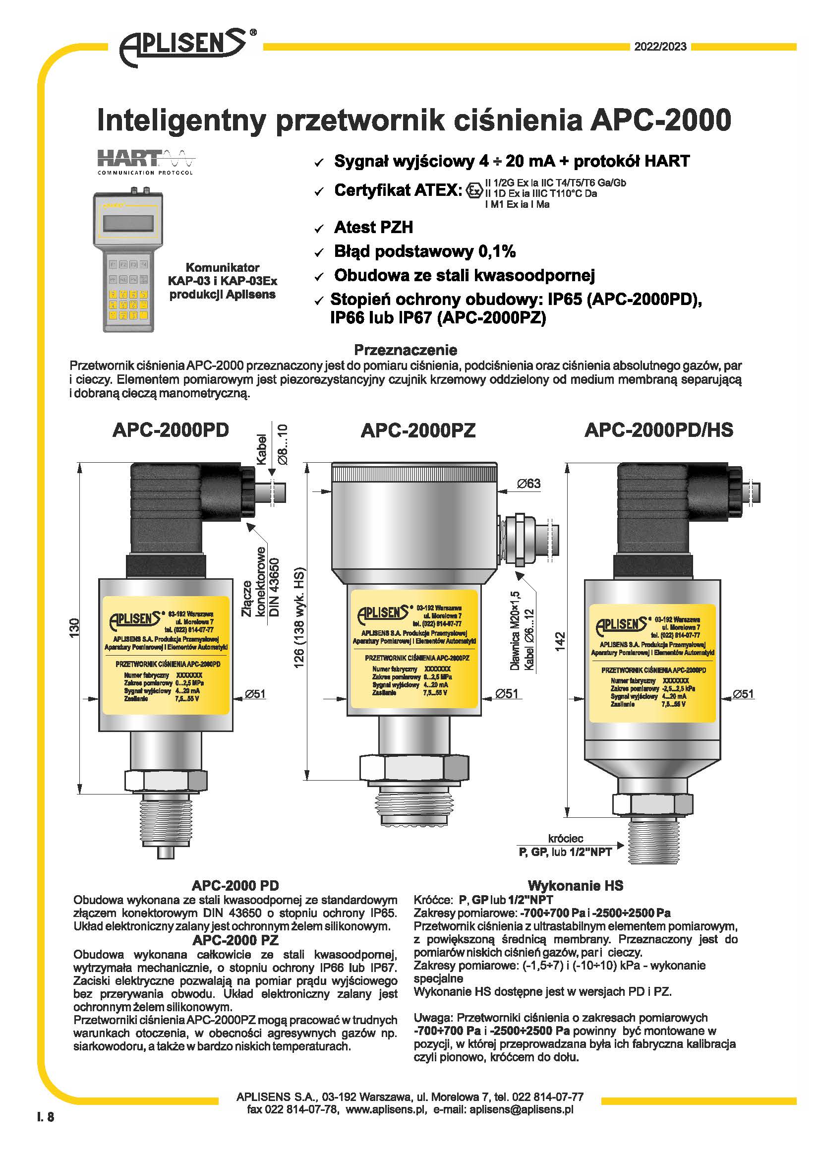 4 ÷ 20 mA输出信号+ Hart 协议。证书和认证:ATEX、PZH基本误差0.1%外壳由耐酸钢制成外壳防护等级为IP-65、IP-66或IP-67