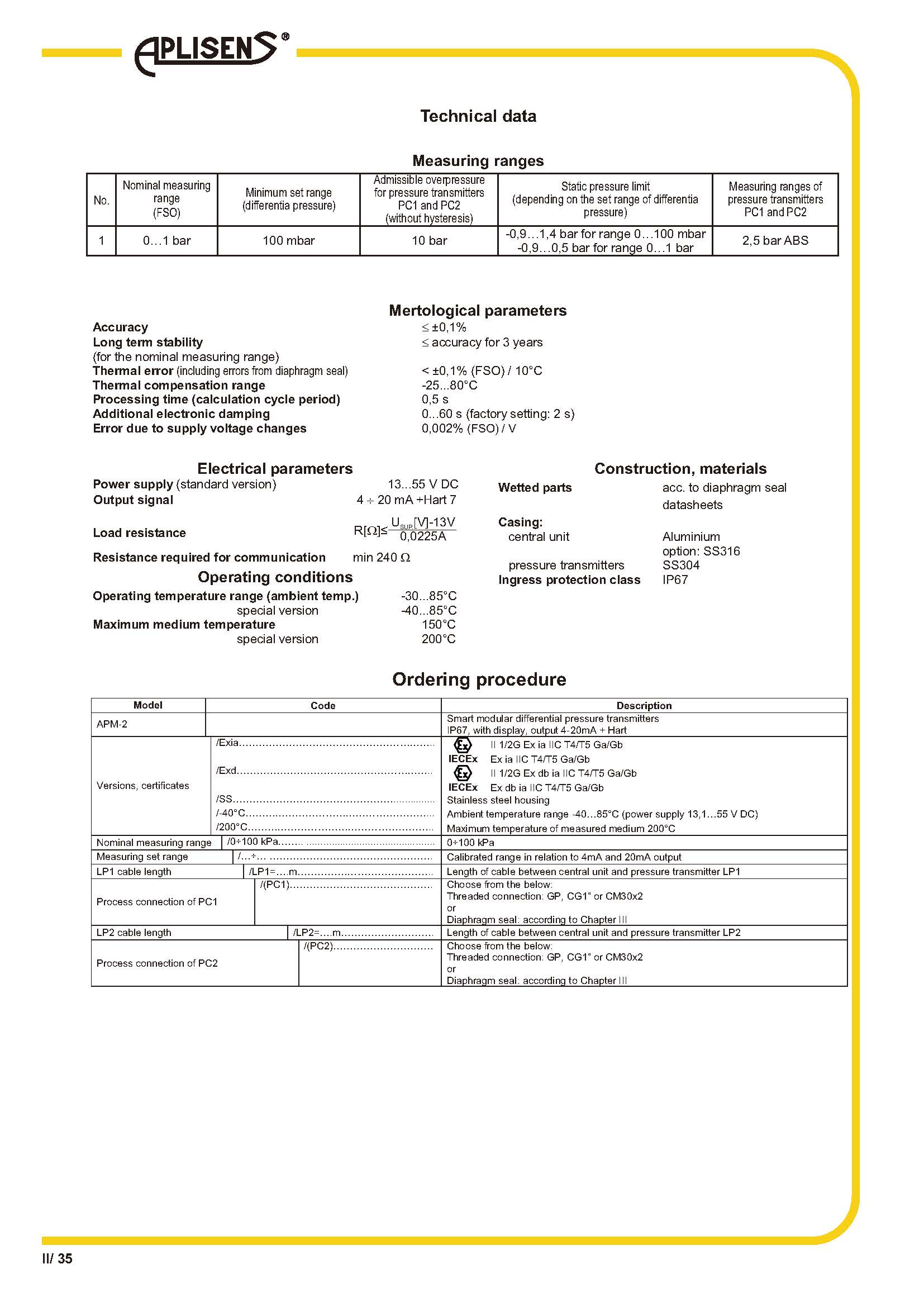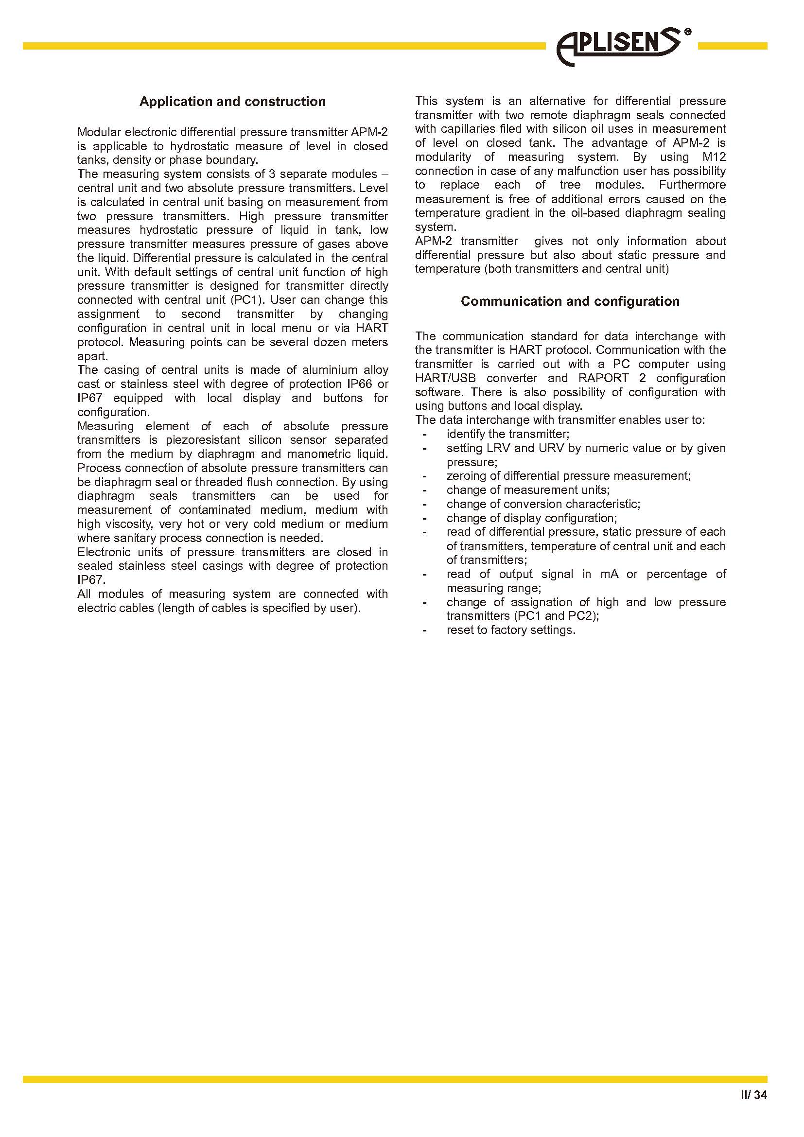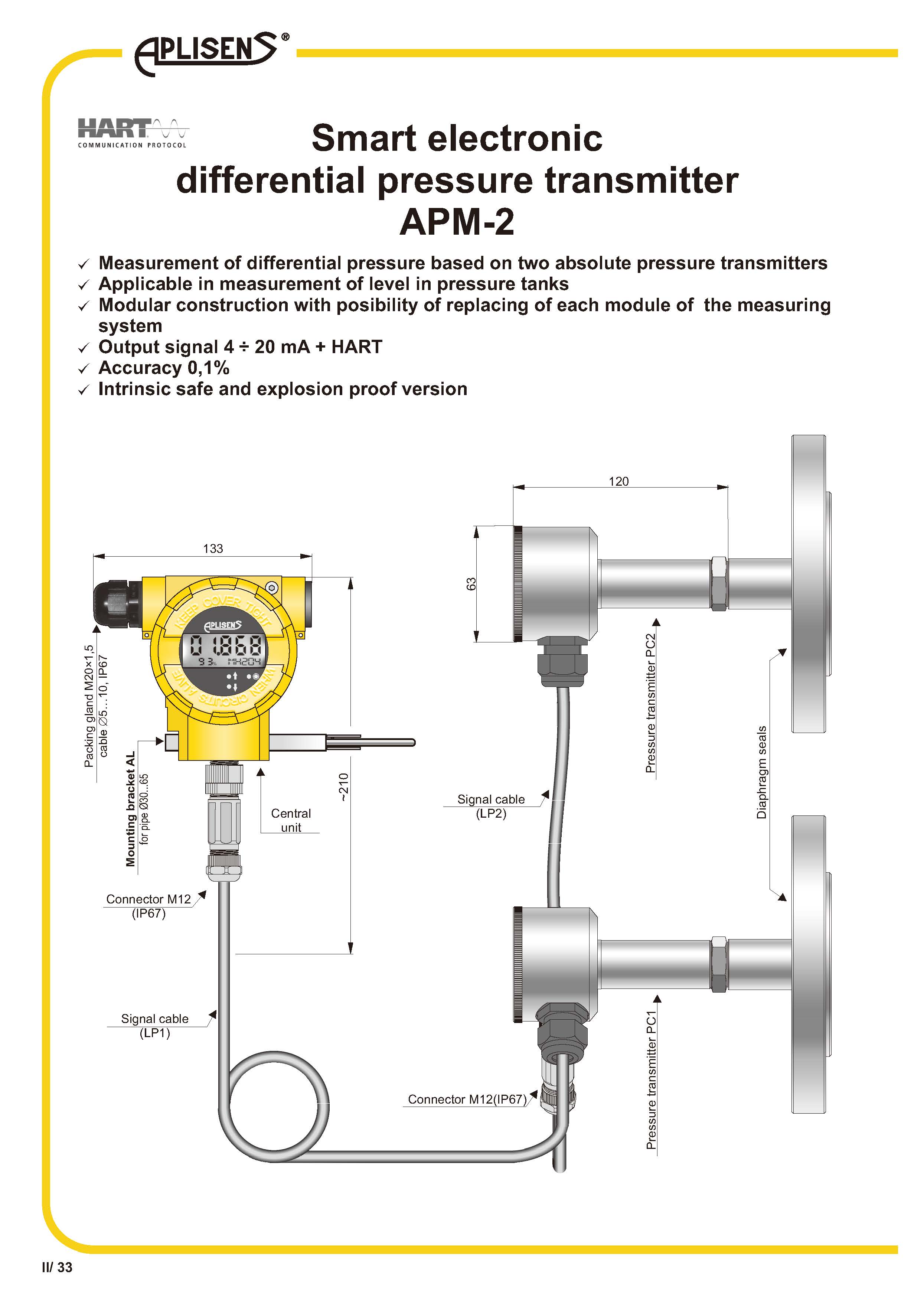 基于两个绝对压力变送器的差压测量模块化结构,可更换测量系统的每个模块输出信号 4 ÷ 20 mA + HART准确度 0.1%