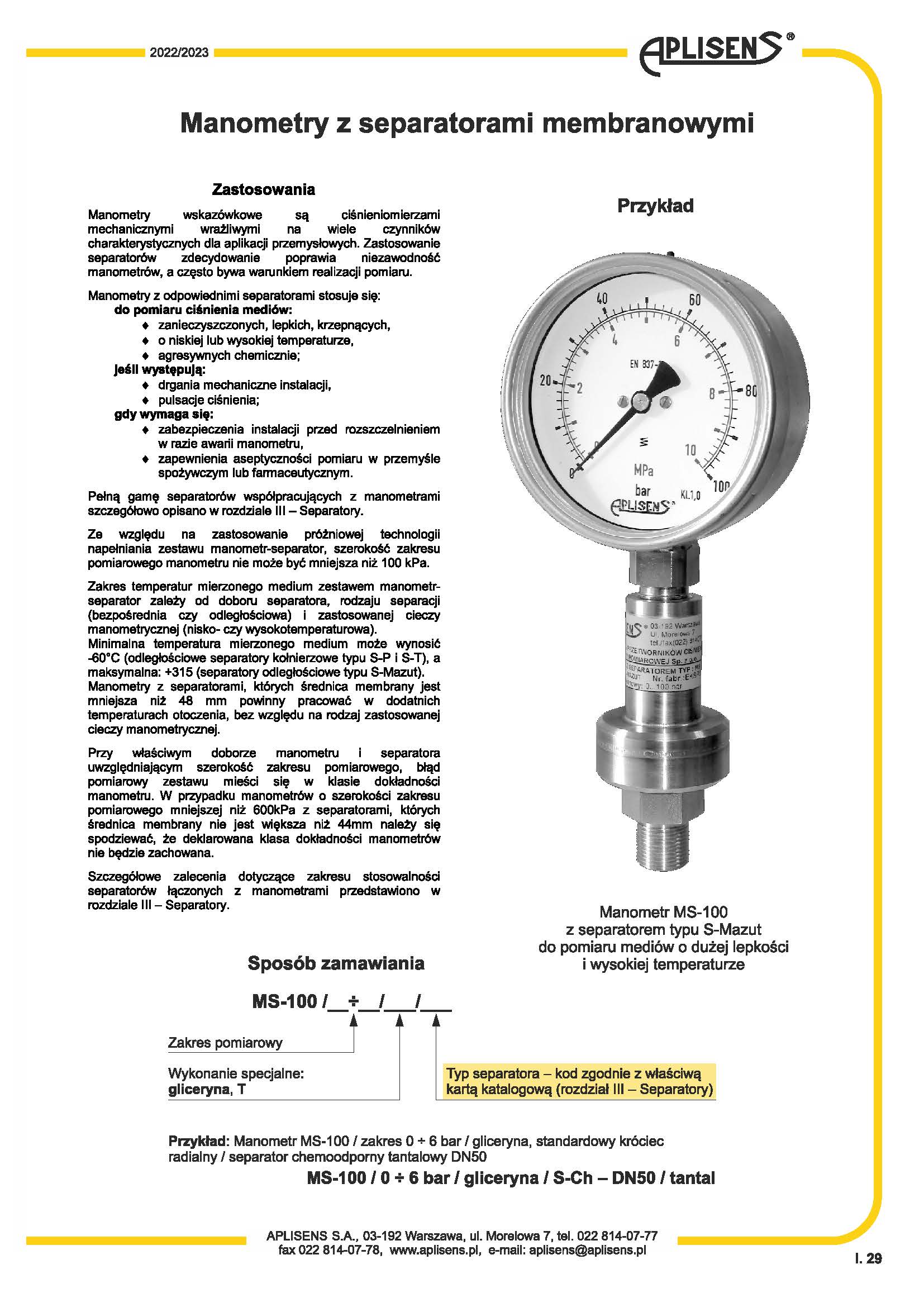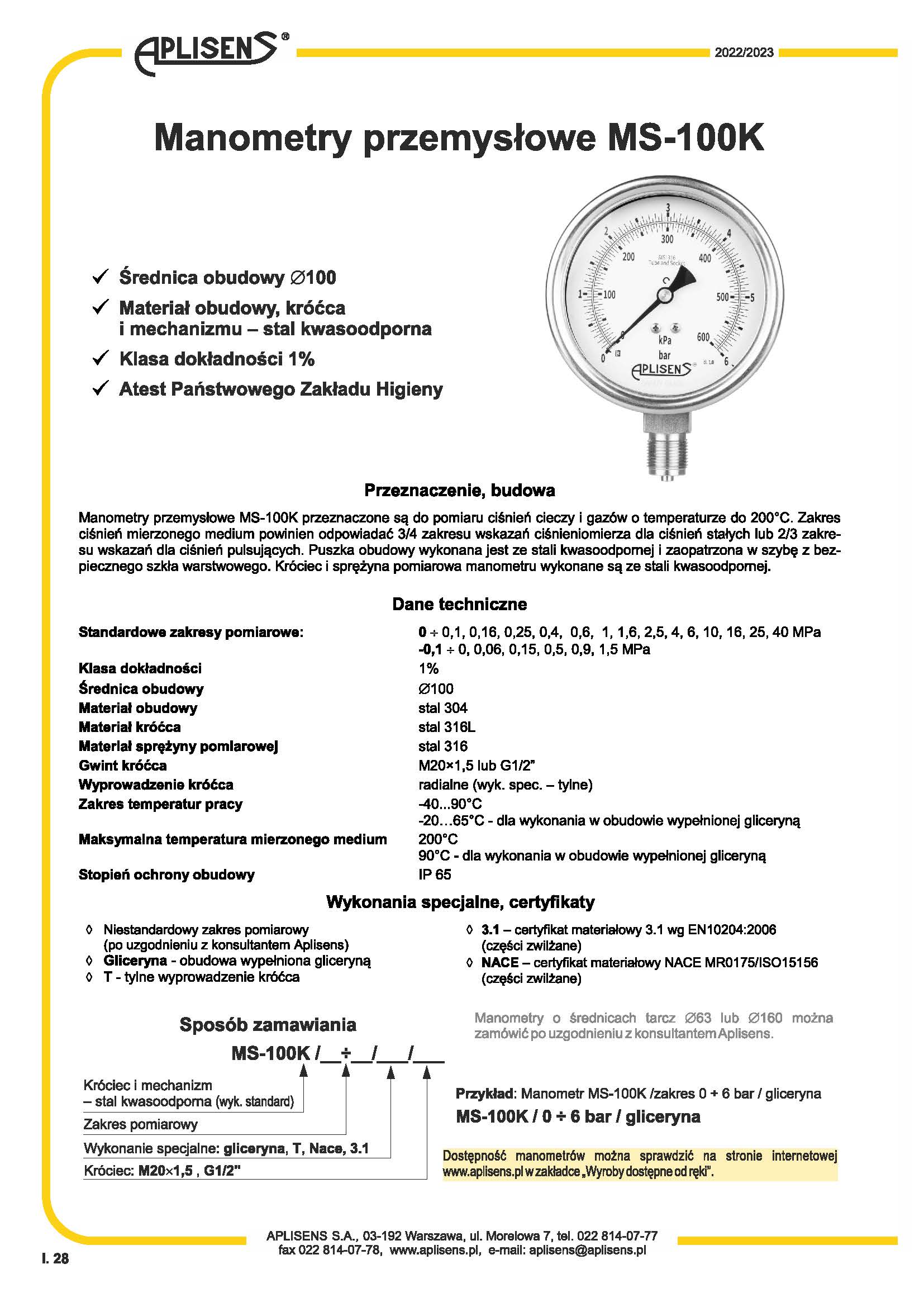 测量范围从0 ... 0.1 MPa 到 0 ... 40 MPa外壳直径 O 100。外壳、短柱和机构材料 -不锈钢。精度等级1%。国家卫生研究院证书